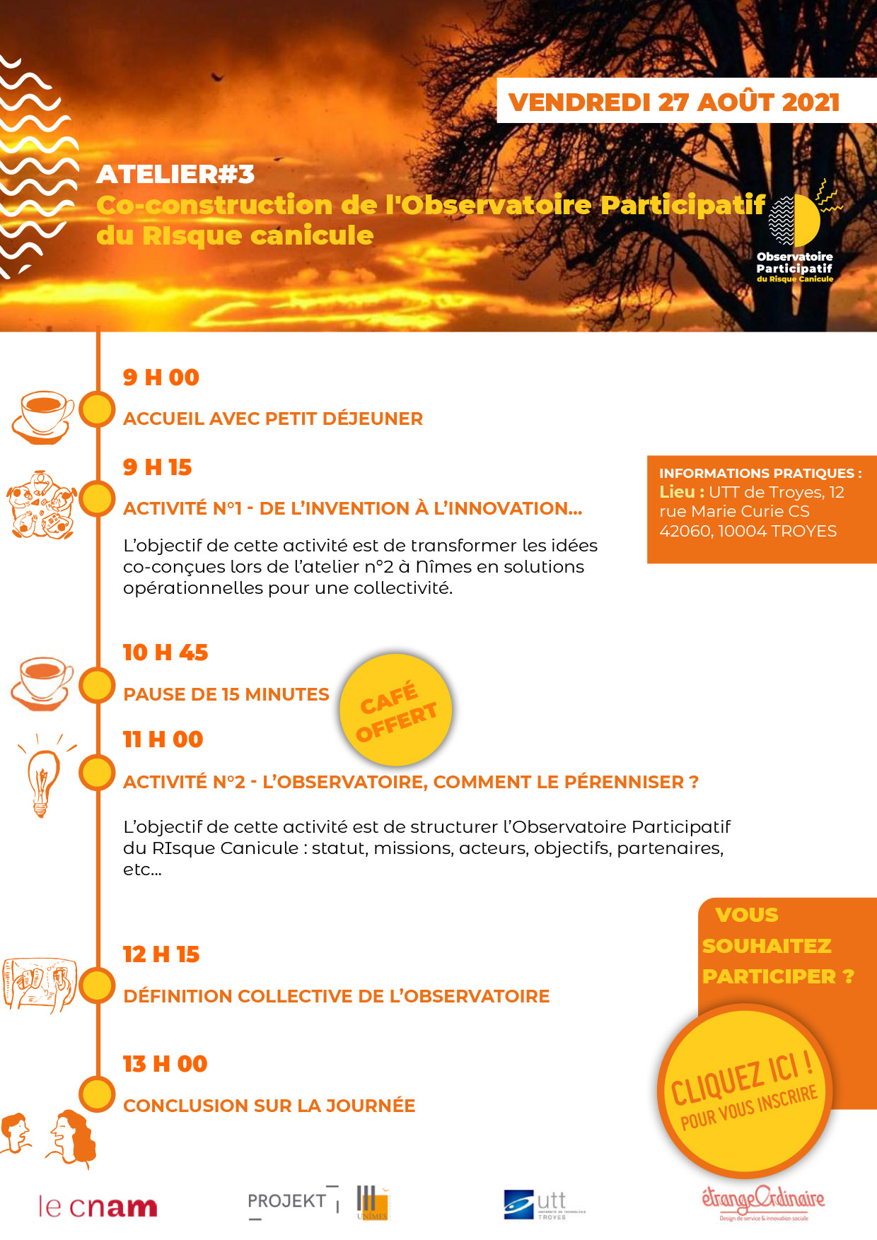 En cette fin d'été, participez à un atelier ouvert à tous pour co-construire l’observatoire participatif du risque canicule ce vendredi 27 août de 9h à 13h30 dans l'amphi de verdure, 100% présentiel, avec buffet gratuit et pass sanitaire préconisé.
