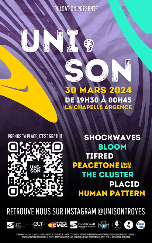Ce festival, organisé par le club de musique Pulsation du BDE UTT, se déroulera le samedi 30 mars 2024 de 19h30 à 00h45 à la Chapelle Argence, au centre-ville de Troyes (Boulevard Gambetta).